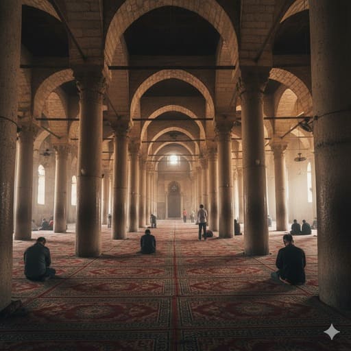 The interior of Amr ibn al-As Mosque in Fustat, Cairo, with its vast prayer hall and numerous columns, bathed in soft, natural light. A few people (Indonesian ethnicity, consistent characters) are seen praying or contemplating in the background.