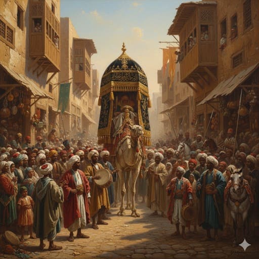A historical depiction of the Mahmal procession in old Cairo, with a grand, decorated palanquin being carried through crowded streets, surrounded by people in traditional attire. The scene should be vibrant and full of historical detail.