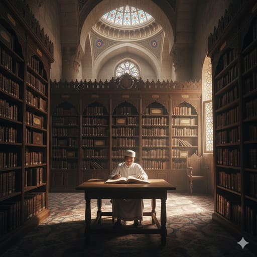 The interior of a grand, ancient library within Al-Azhar University, with tall wooden bookshelves filled with old manuscripts. A student (Indonesian ethnicity, consistent character) is seen engrossed in reading, bathed in soft, scholarly light.