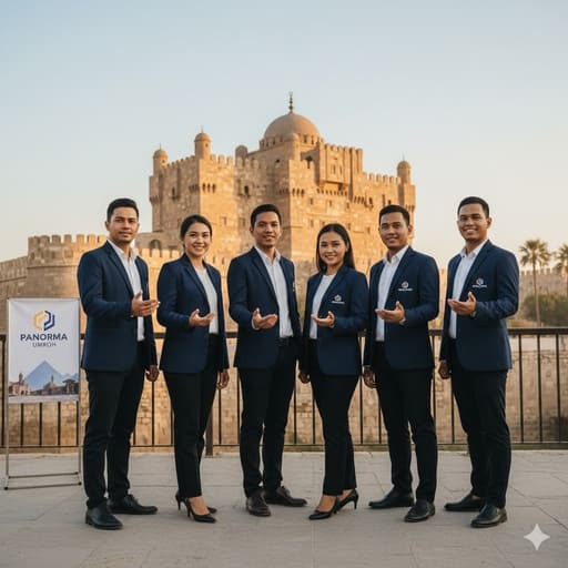 A professional and friendly team from Panorama Umroh, standing in front of a historical landmark in Cairo (e.g., Citadel of Salah al-Din), smiling and welcoming. The scene should convey trustworthiness and expertise.