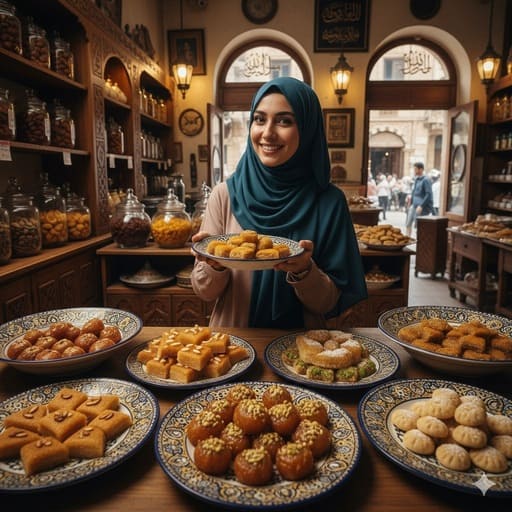 Berbagai macam manisan Mesir seperti Basbousa dan Kunafa tersaji di piring-piring cantik di sebuah toko kue tradisional.