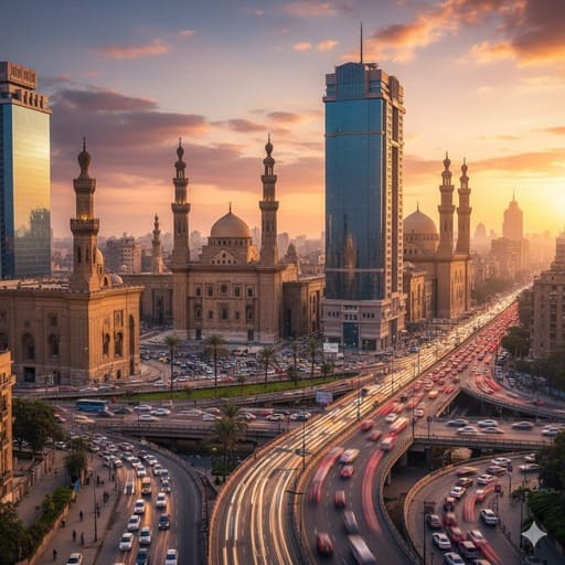 Prompt 5: Pemandangan modern Kairo dengan beberapa bangunan bersejarah Islam yang menonjol di tengah kota yang sibuk. Kontras antara kuno dan modern, suasana dinamis.