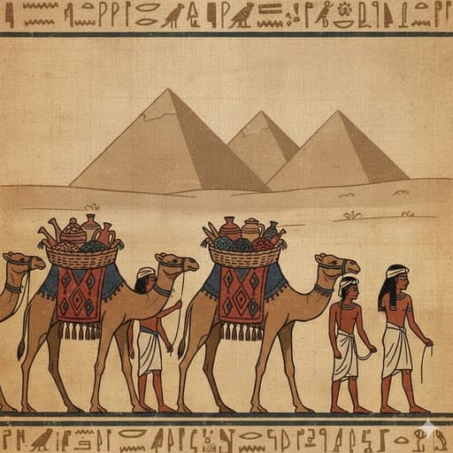 Gambar 1: Ilustrasi karavan Mesir kuno yang membawa barang dagangan melintasi gurun, dengan piramida di kejauhan. Gaya lukisan dinding Mesir, warna tanah, suasana kuno.