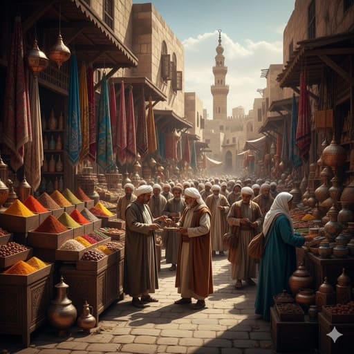 Gambar 4: Sebuah pasar tradisional yang ramai di Kairo Islam, dengan pedagang dan peziarah berinteraksi. Banyak rempah-rempah, tekstil, dan kerajinan tangan. Suasana hidup, warna-warni.