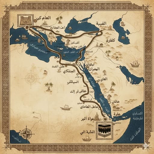 Gambar 2: Peta kuno yang menunjukkan rute Jalur Haji Mesir dari Kairo ke Makkah, dengan penekanan pada kota-kota penting di sepanjang jalan. Gaya peta abad pertengahan Islam, warna coklat dan krem.