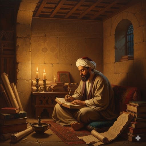 Prompt Gambar 4: Ilustrasi Ibnu Atha’illah al-Sakandari sedang menulis kitab Al-Hikam di sebuah ruangan yang tenang dengan cahaya lilin, dikelilingi oleh gulungan-gulungan naskah. Gaya lukisan klasik, suasana kontemplatif.