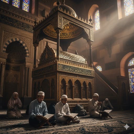 Prompt Gambar 5: Sekelompok jamaah umroh sedang melakukan ziarah di salah satu makam sufi di Mesir, dengan pemandu yang menjelaskan sejarahnya. Suasana khusyuk dan penuh rasa ingin tahu, latar belakang arsitektur Islam yang indah.