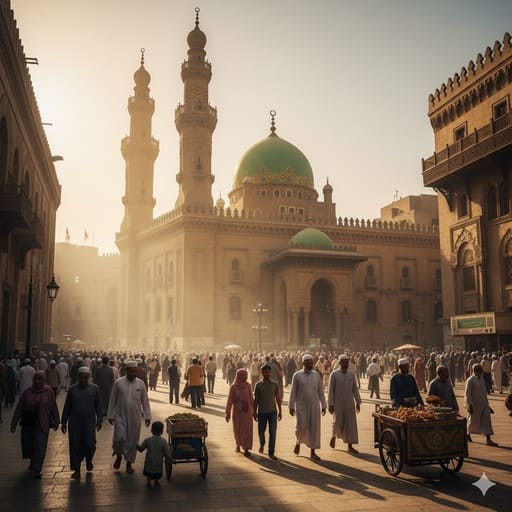 Prompt Gambar 3: Pemandangan eksterior Masjid Imam Husain di Kairo yang ramai, dengan menara-menara yang menjulang tinggi dan kubah hijau. Banyak orang beraktivitas di sekitar masjid, suasana spiritual yang hidup.