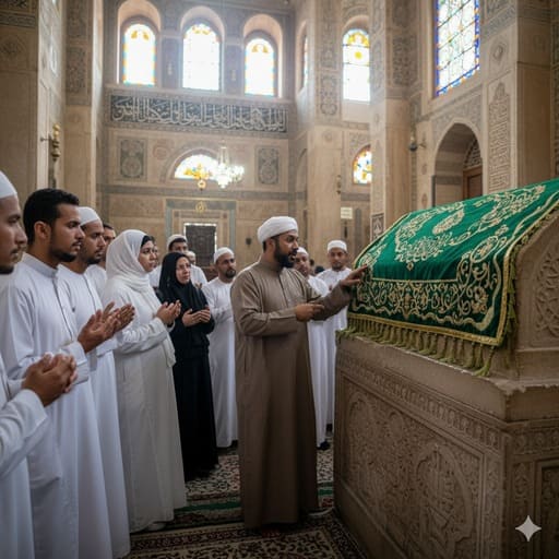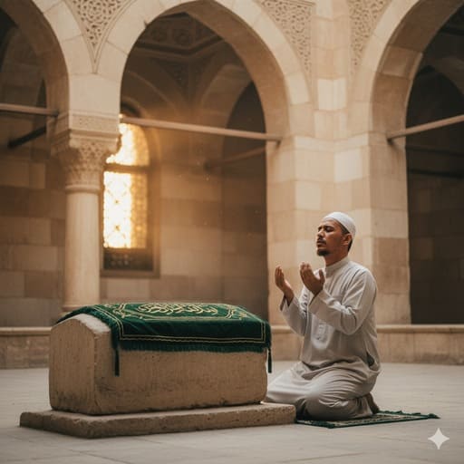 Prompt Gambar 1: Seorang peziarah Muslim sedang berdoa dengan khusyuk di depan sebuah makam yang sederhana namun terawat, dengan latar belakang arsitektur Islam kuno. Suasana damai dan penuh penghormatan, pencahayaan lembut.